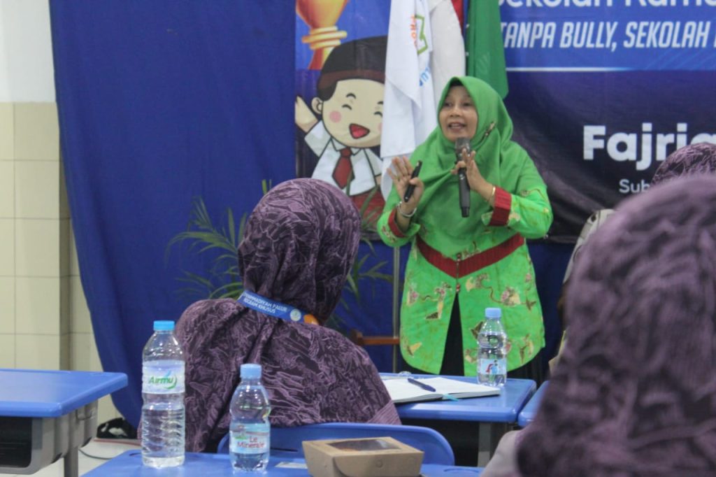 Ibu Fajriah menyampaikan bahwa untuk menjadi satuan pendidikan ramah anak syaratnya adalah mendeklarasikan terlebih dahulu secara umum kepada masyarakat. Baru kemudian mendapatkan SK SRA. Stakeholder harus menyamakan persepsi dan mind set untuk mewujudkan pendidikan yang ramah anak dengan memahami 3 Pilar, 4 hak dasar anak, 5 prinsip utama SRA dan 6 komponen pendukungnya.